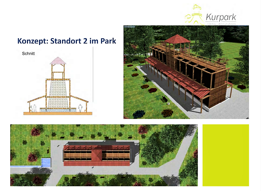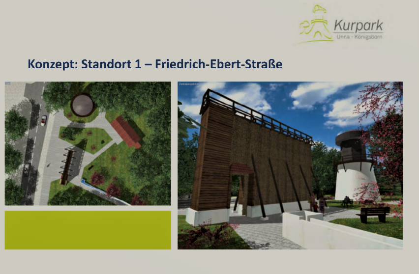 „Wir können den Wunsch nach einem Gradierwerk in Erinnerung an das baukulturelle Erbe des ehemaligen Bad Königsborn nachvollziehen“ bekräftigt Claudia Keuchel. „Wir sehen aber in der Fläche direkt neben dem Ensemble Friedrichsborn den besseren Standort. Auch dort wäre Platz für ein gut 25 Meter langes Bauwerk und es ist sogar näher an der Historie und dem