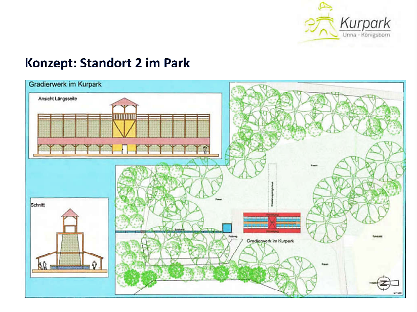 Neben einer Vielzahl von Verbesserungsmaßnahmen im Kurpark hatte sich der Verein vor Jahren auch zum Ziel gesetzt, mit der Neuerrichtung eines funktionierenden Gradierwerkes an die Historie von „Bad Königsborn“ anzuknüpfen. Öffentliche Mittel, private Sponsoren und ein ausschließlich für Kurparkbelange festgelegter Geldbetrag, sollten die Finanzierung sichern. Der städtische Beitrag hätte sich auf die Überlassung des erforderlichen Grundstückes beschränkt.“