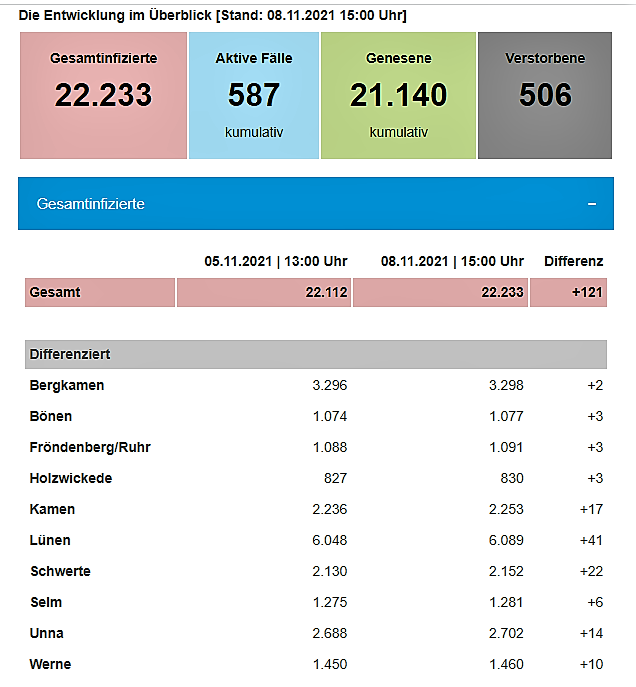 Verstorben ist am 6. November ein 84 Jahre alter Mann aus Lünen. Er hatte den Status „geimpft“.