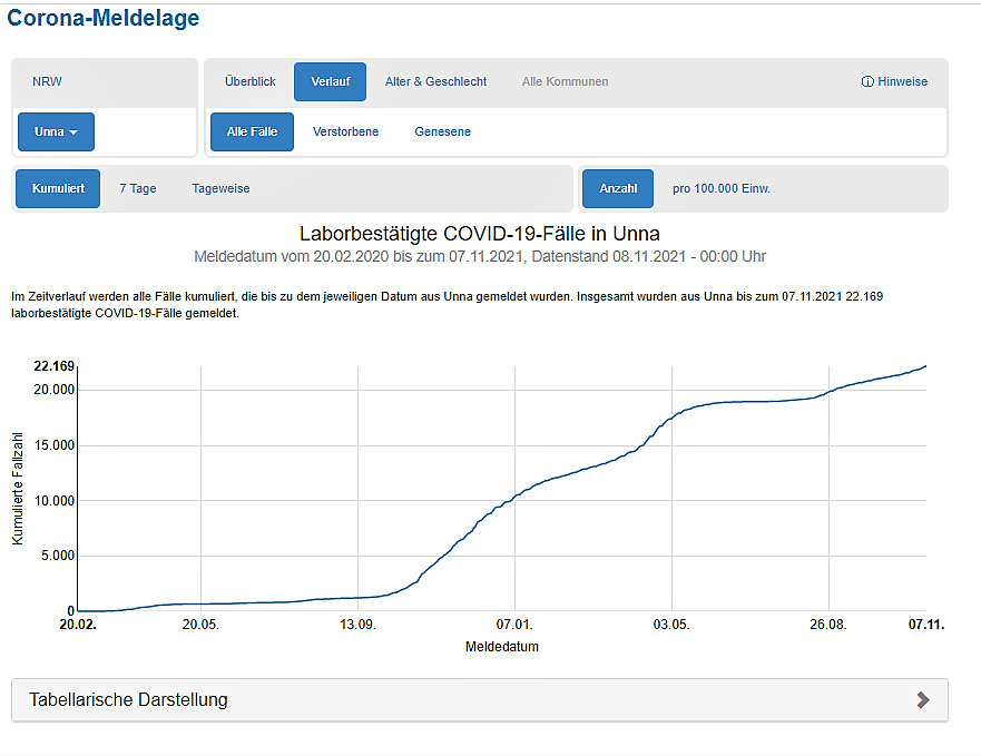 Insgesamt sind damit im Kreis Unna 22.233 Fälle gemeldet worden. 21.140 Personen gelten als wieder genesen. Die Zahl der aktuell infizierten Personen klettert auf 587. Ebenso steigt die Zahl der stationären Patienten an, sie liegt am heutigen Montag bei 26.