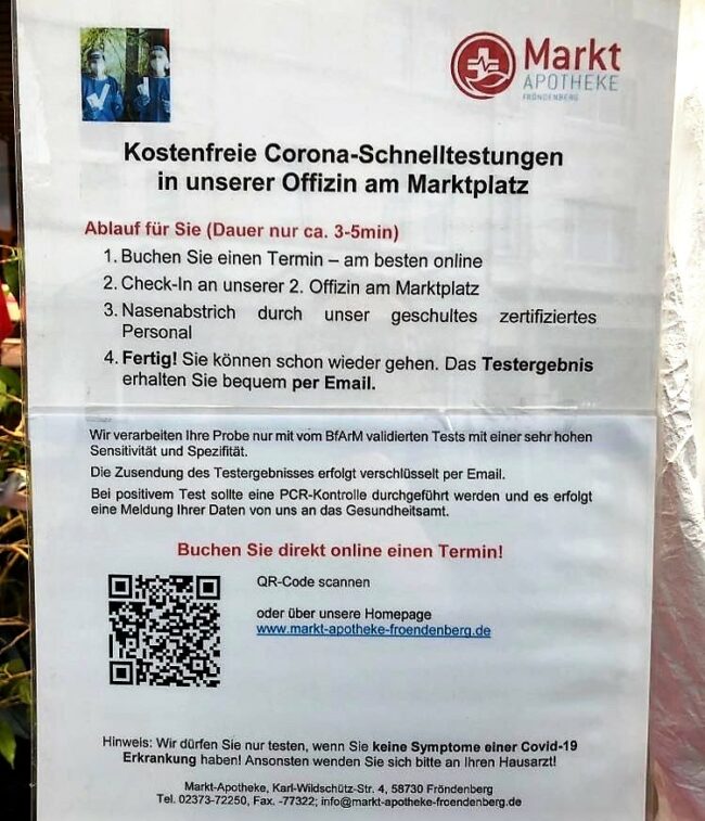 Die meisten arbeiten mit vorheriger Terminabstimmung, so etwa die Markt-Apotheke in Fröndenberg. Ein Schnelltest dauert dort einige Minuten, das Ergebnis bekommen die Getesteten binnen einer halben bis einer Stunde aufs Handy übermittelt.