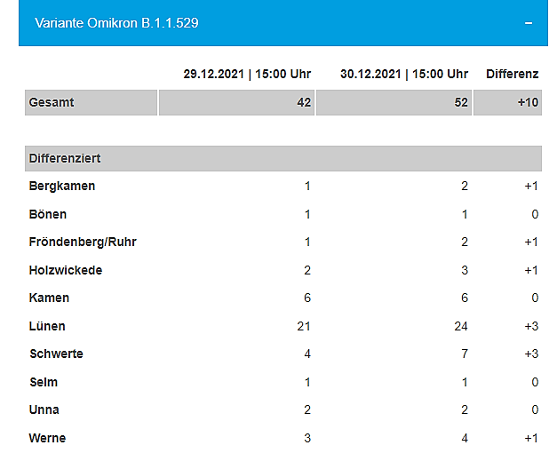 Am 29. und 30. Dezember wurden der Kreisgesundheitsbehörde insgesamt 264 neue Fälle, 21 weitere Omikron-Fälle und 3 weitere Todesfälle gemeldet. Es starben