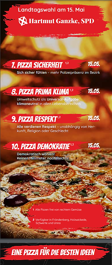 Die ersten fünf Wählerinnen und Wähler, die Hartmut Ganzke eine Mail mit ihren Ideen und Wünschen für die nächste Legislaturperiode schicken (an: info@hartmut-ganzke.de), dürfen sich auf einen Pizzaabend mit dem Abgeordneten freuen.