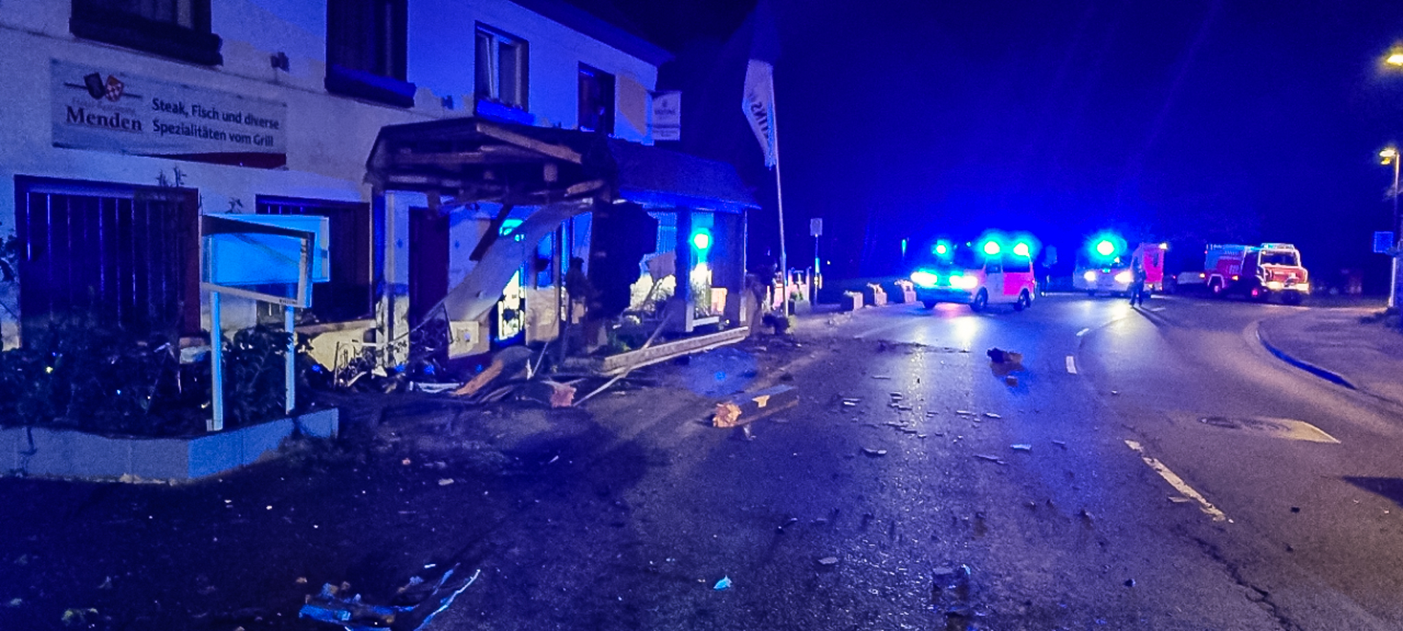 In der Nacht von Freitag auf Samstag ereignete sich auf der Unnaer Landstraße in Menden ein schwerer Verkehrsunfall. Ein Auto kam in einer Kurve von der Straße ab und krachte gegen das Vordach eines Restaurants, teilte am Samstag die Freiwillige Feuerwehr Menden mit.