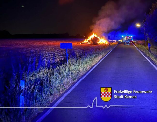 Auf einem Feld in der Straße Altenmethler gelagerte Strohballen sorgten für eine unruhige Nacht des Löschzuges 2 der Feuerwehr Kamen.