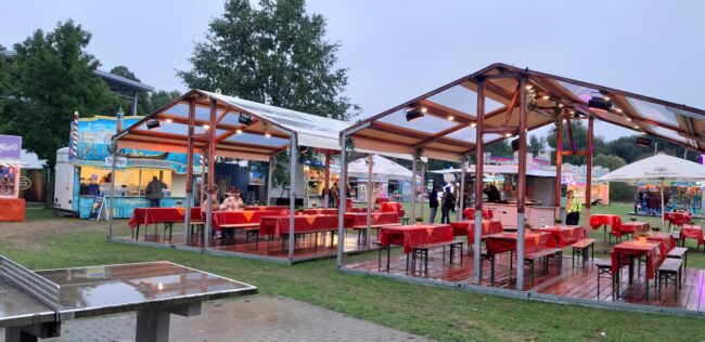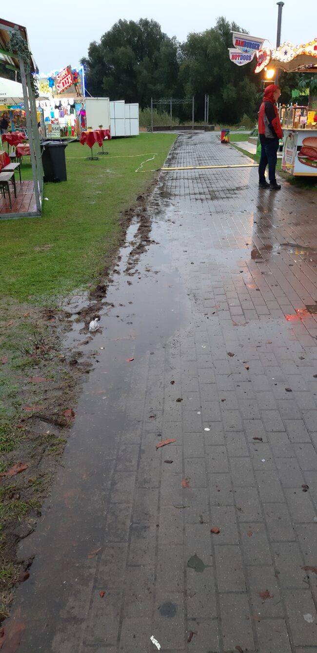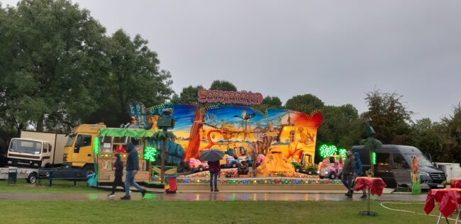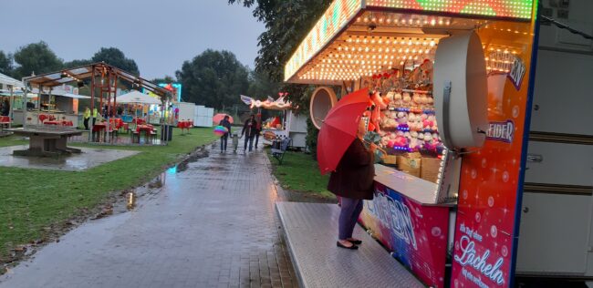 Die Wiese im Himmelmannpark war nach dem nahezu pausenlosen Regen am Sonntag und den Platzschauern am Samstag bereits so durchgeweicht, dass Sorge aufkam, nach einem weiteren angesagten Regentag mit den schweren Fahrgeschäften buchstäblich im Schlamm zu versinken  und nicht mehr vom Gelände zu kommen.