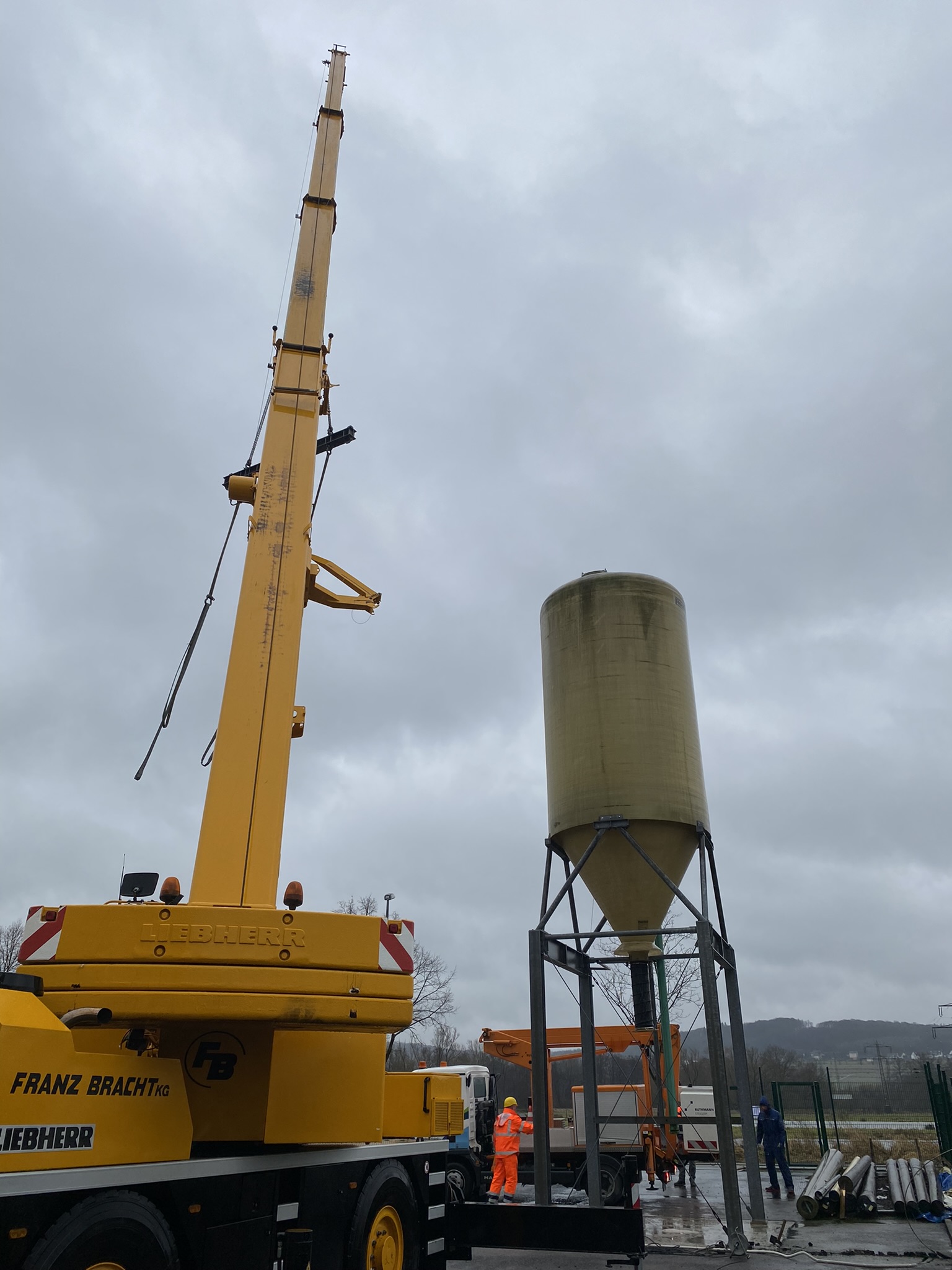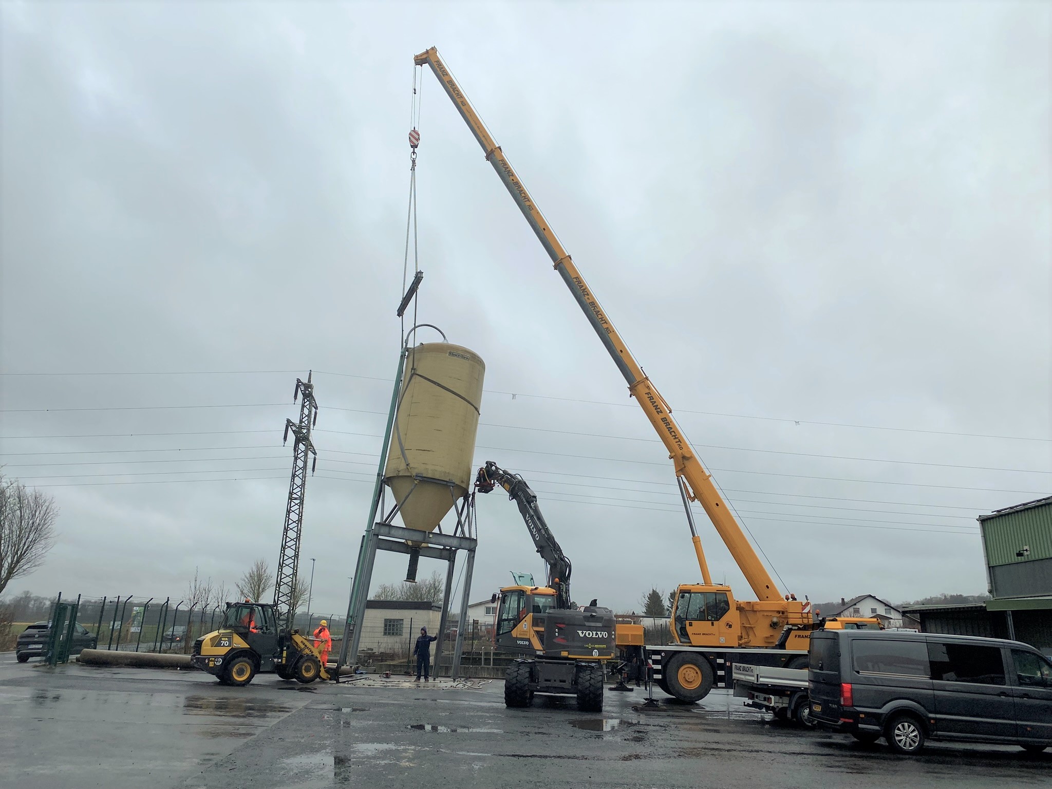- Abbau des alten Salzsilos bei den Stadtwerken Fröndenberg Wickede. An seine Stelle kommt ein neuer Behälter mit größerem Fassungsvermögen. Aus dem Silo werden Streufahrzeuge mit Streuslaz befüllt.