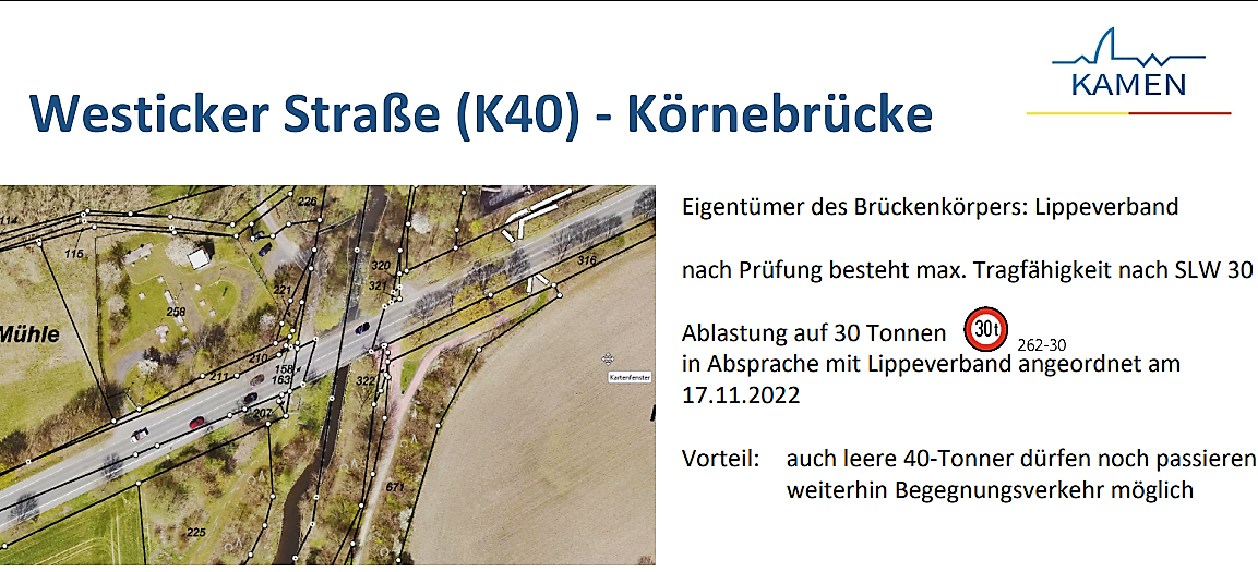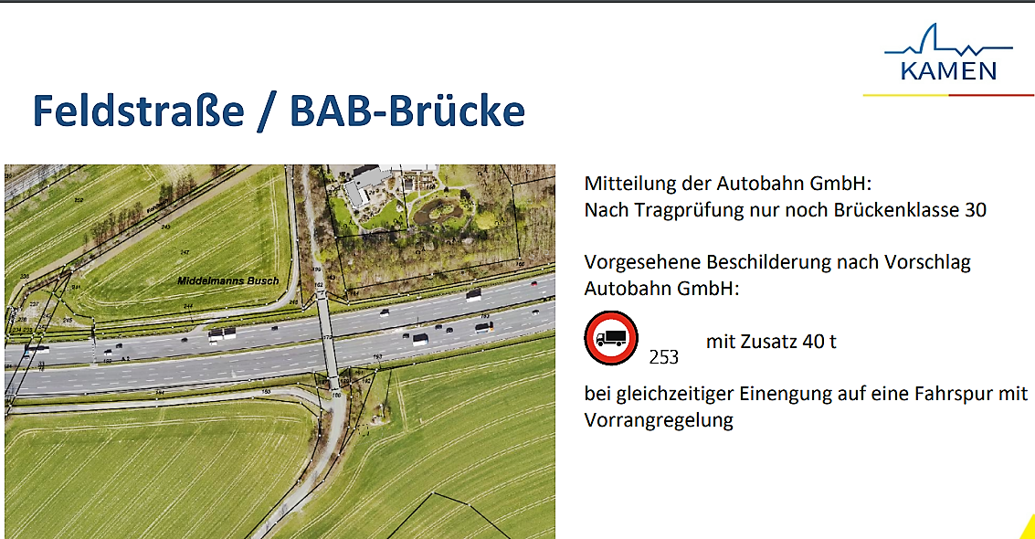 Betroffen von den Einschränkungen sind die Autobahnbrücken an der Derner Straße und an der Feldstraße, zusätzlich die Körnebrücke auf der Westicker Straße und die Sesekebrücke auf der Derner Straße.