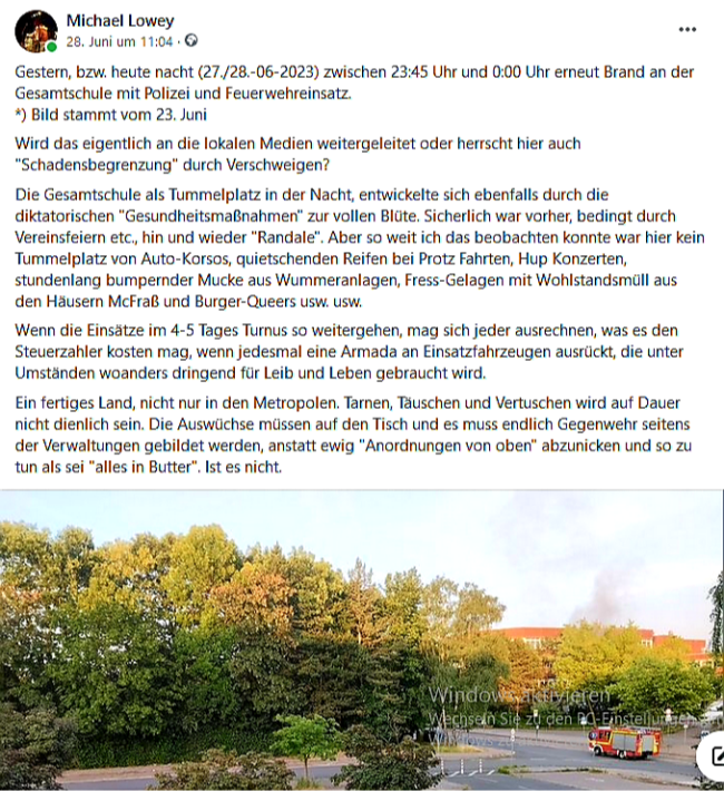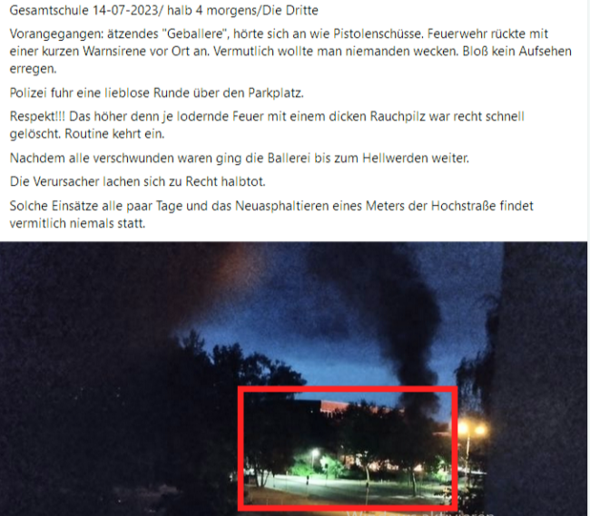 „Eine Recherche in unseren Systemen hat ergeben, dass der Polizei keine „Randale“ gemeldet wurde. Ich kann Ihnen lediglich einen brennenden Müllcontainer gegen 4.20 Uhr auf dem Gelände der Gesamtschule bestätigen.