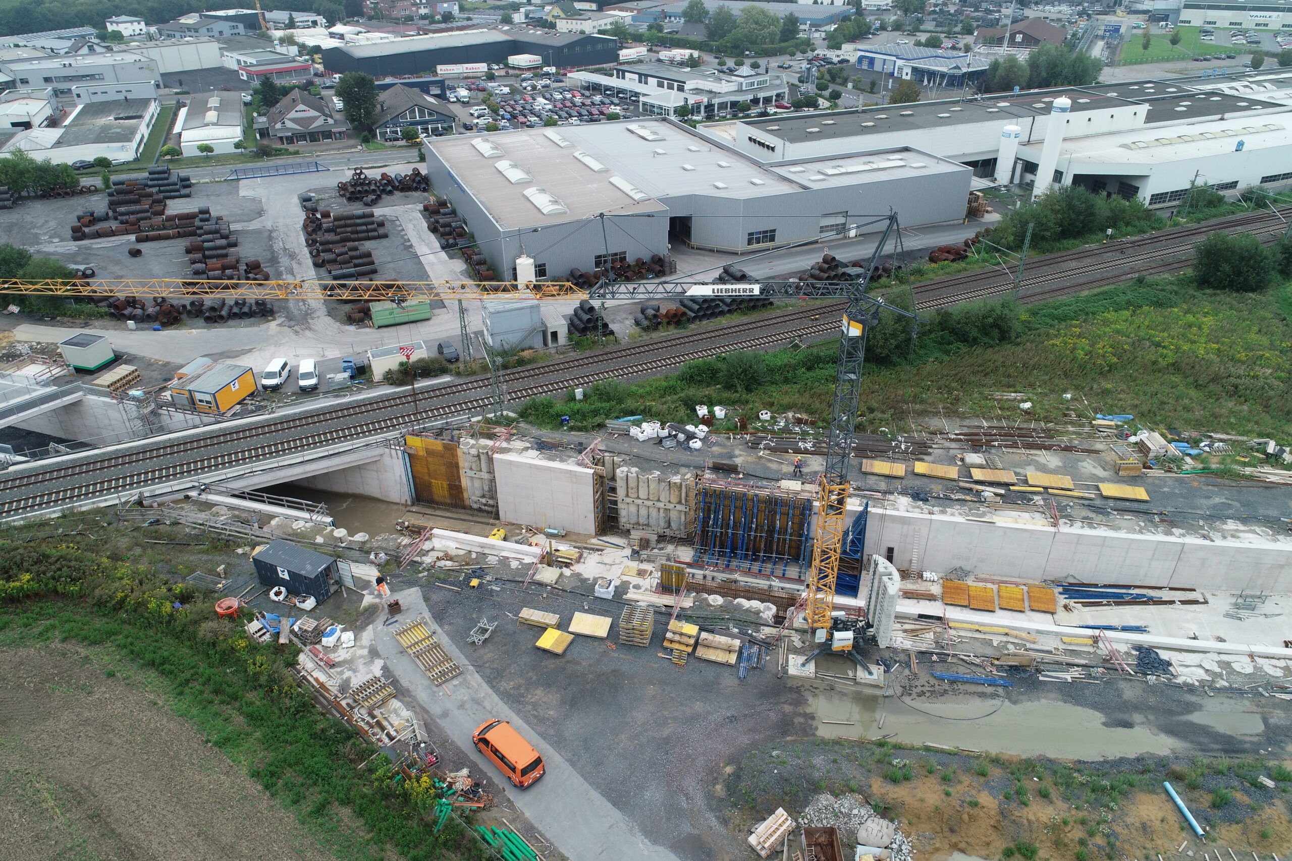 Der Kreisverkehr ist hergestellt und das 200 Meter lange Trogbauwerk unterhalb der Bahnschienen steht vor der Fertigstellung: