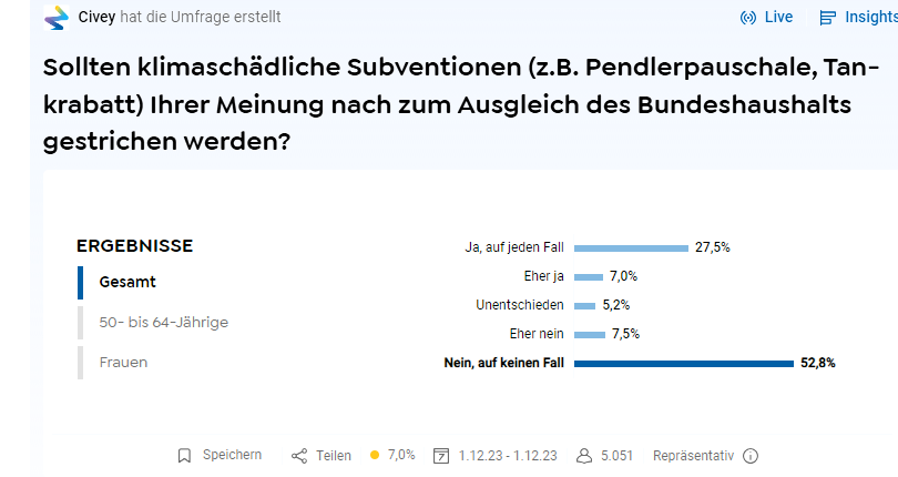 Diese Umfrage stellt zum heutigen Freitag, 1. 12., das Umfrageinstitut Civey online. Bis zum frühen Abend hatte immerhin ein knappes Drittel für Ja gestimmt (27 Prozent), mehr als die Hälfte der Umfrageteilnehmer ist zugleich strikt dagegen.