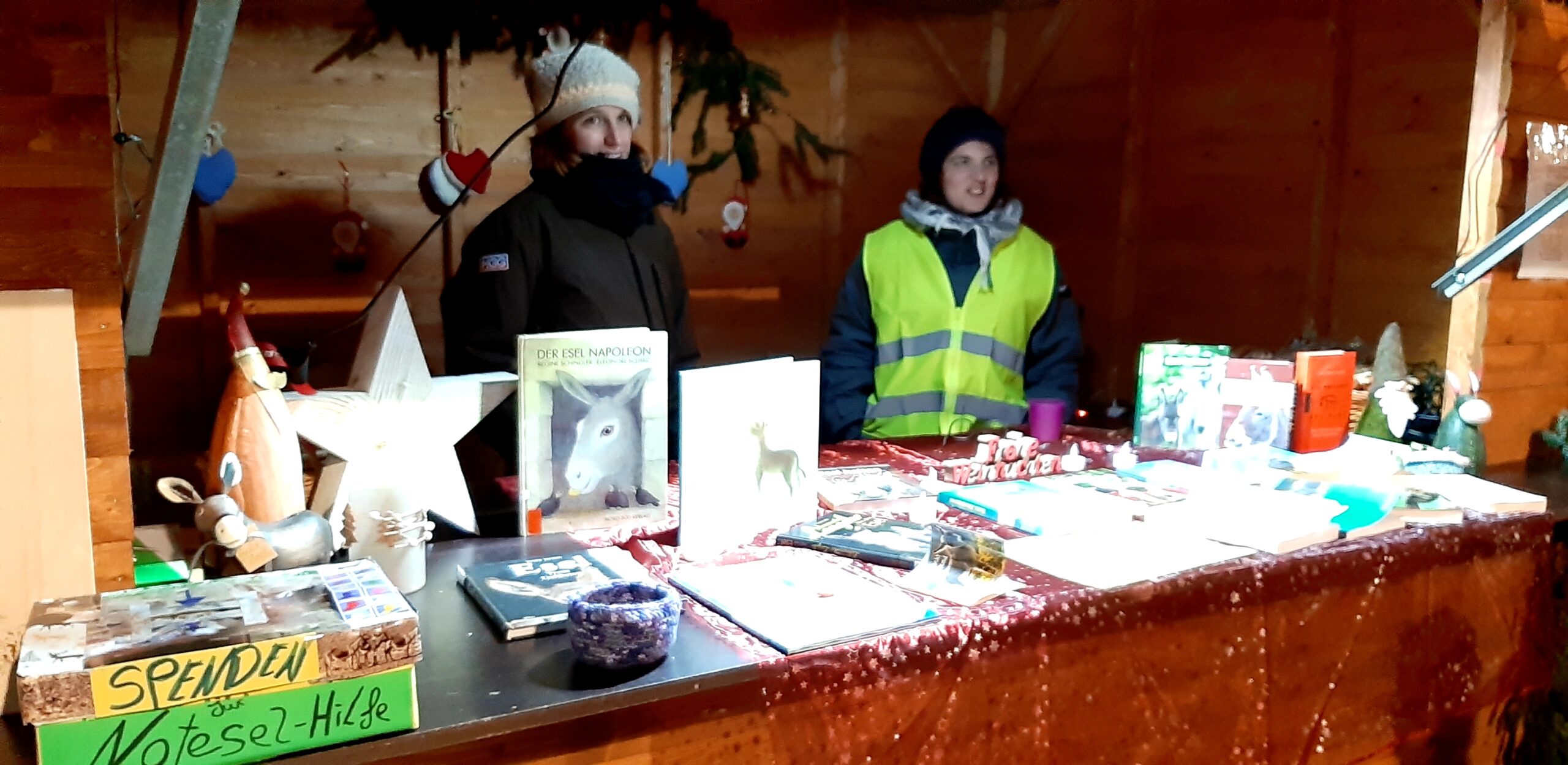 Schneekugeln, Schmuck, Strick- und Filzwaren und viele weitere Weihnachtsartikel werden angeboten.