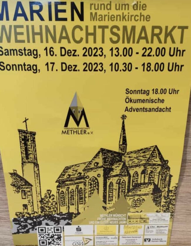 Der Weihnachtsmarkt in Kamen-Methler findet sich ebenfalls am 16. + 17.12.2023 rund um die Marienkirche In der Kaiserau.