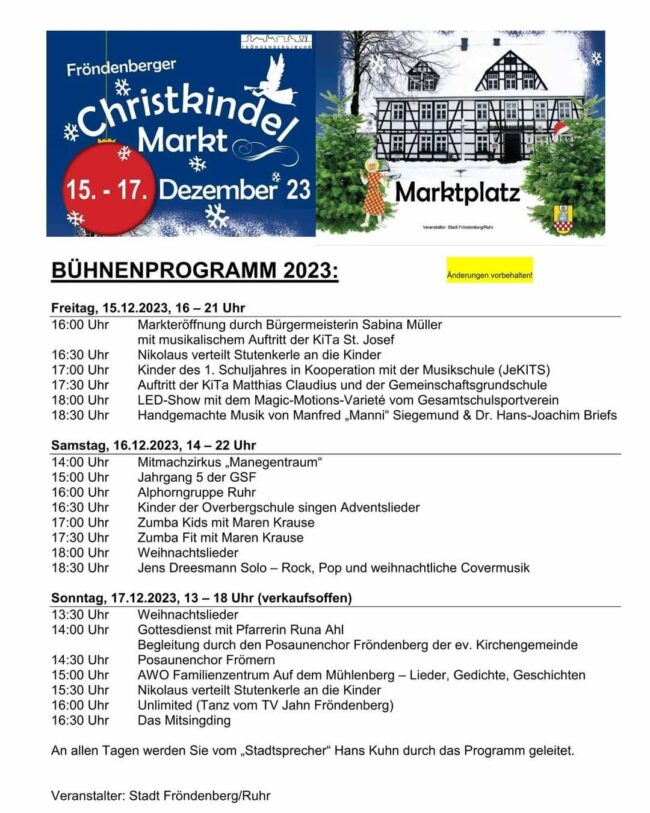 Und von Freitag, 15. bis einschließlich Sonntag, 17. Dezember, verwandelt sich beim Fröndenberger Christkindelmarkt der Markplatz in einen stimmungsvollen Erlebnisort mit vielen Highlights für Groß und Klein.