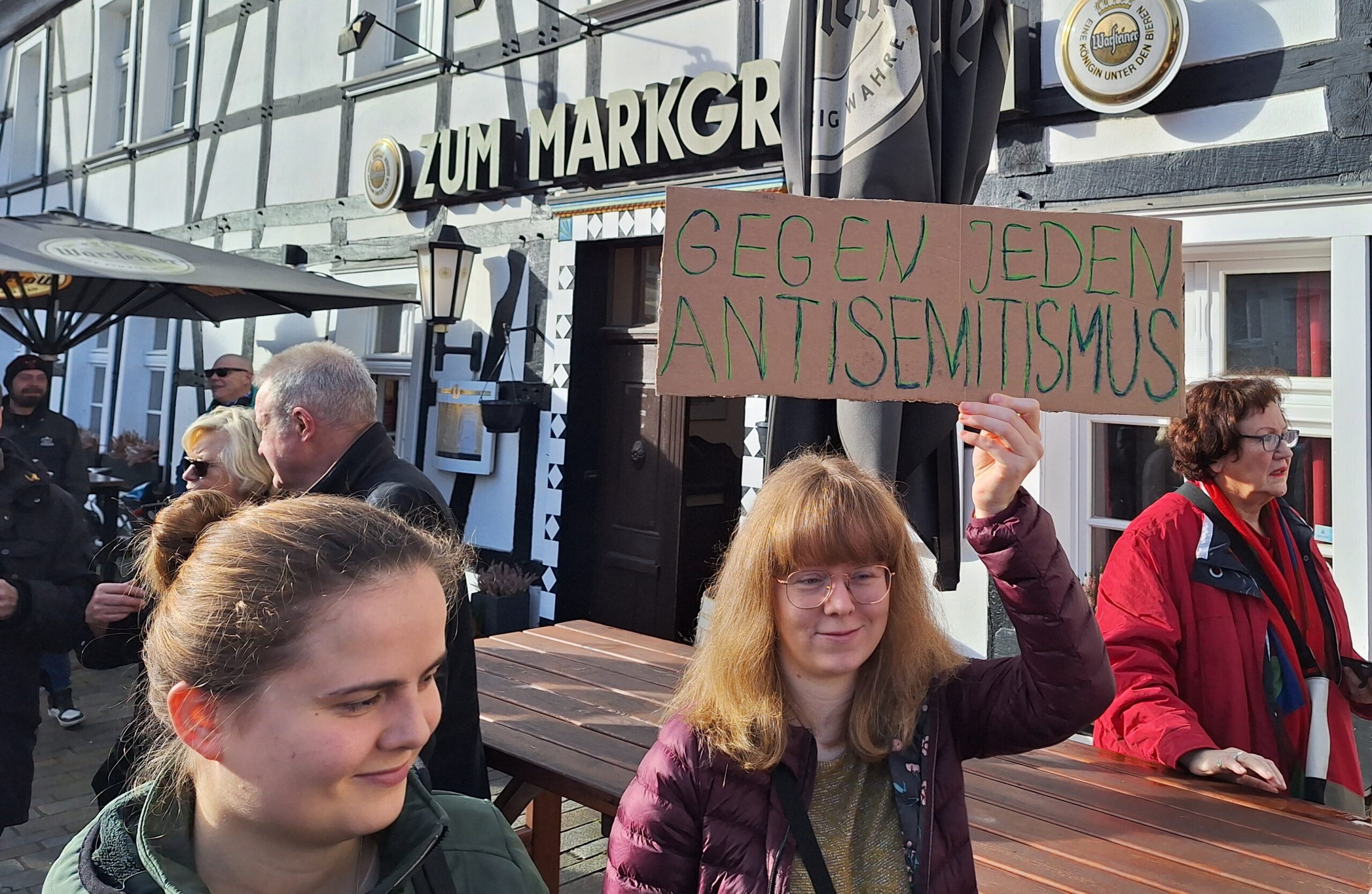 So hatten sich zwei junge Frauen etwas weiter hinten am Markgrafen mit der Mahnung „Gegen jeden Antisemitismus“ platziert. Auf die Bemerkung, dass solche Plakate auf diesen aktuellen Kundgebungen selten zu sehen sind, sagte die Trägerin des schlichten Pappschildes: „Ja, und das finde ich ganz schön traurig.“