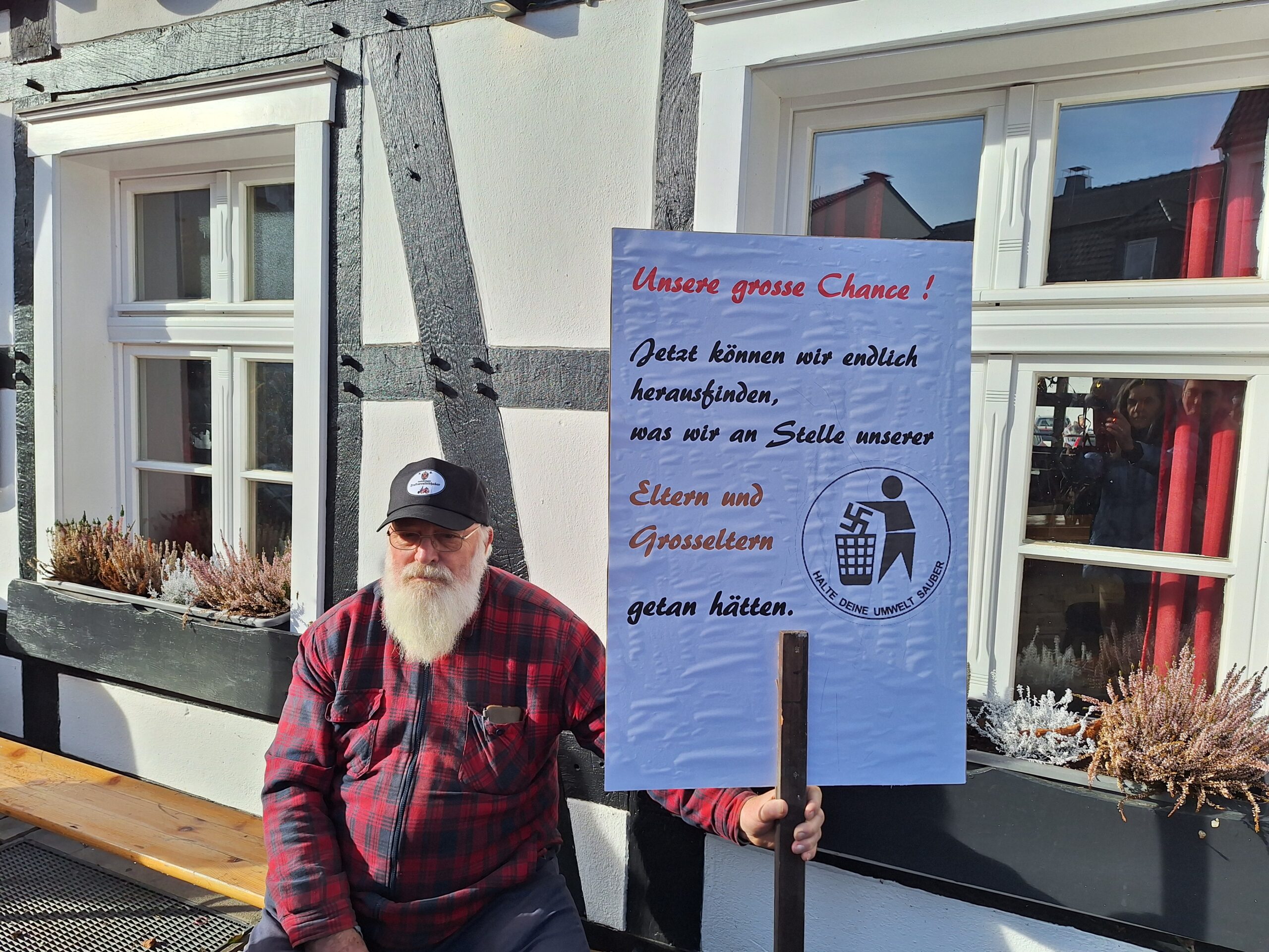 An der Seite vor Eppi´s fiel ein älterer Herr mit Rollator auf. Er hatte sich ein signal-orangefarbenes doppelseitiges Reim-Plakat umgehängt: