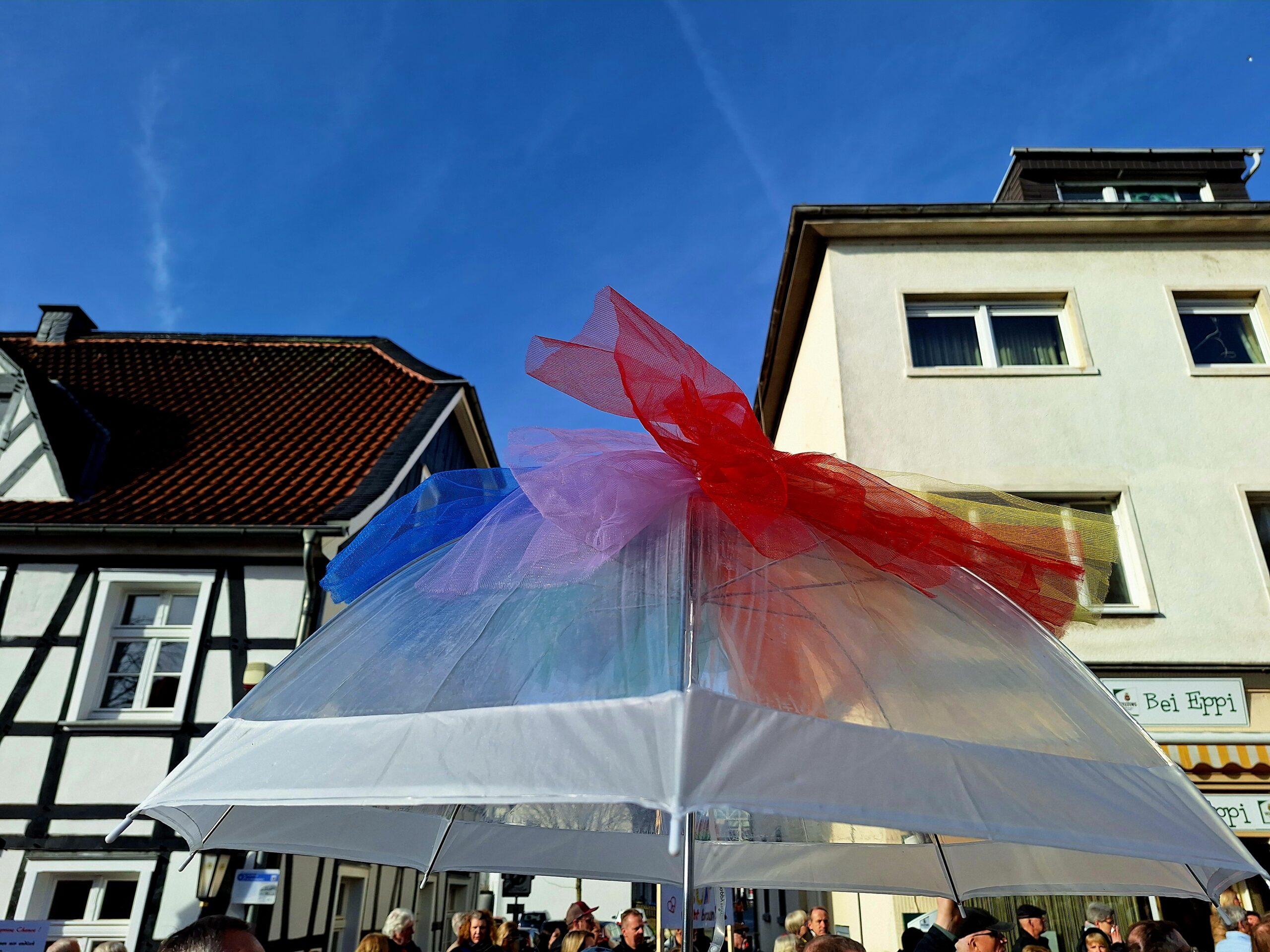 Mit der zweimaligen La Ola-Welle war der Eindruck eines bunten Happenings an diesem Karnevalssamstag (10. 2.) auf dem Fröndenberger Marktplatz perfekt, zumal während der knapp zwei Demo-Stunden eine fast frühlingshaft warme Sonne vom blauen Himmel schien und das bunte Farbenmeer so richtig zum Leuchten brachte.