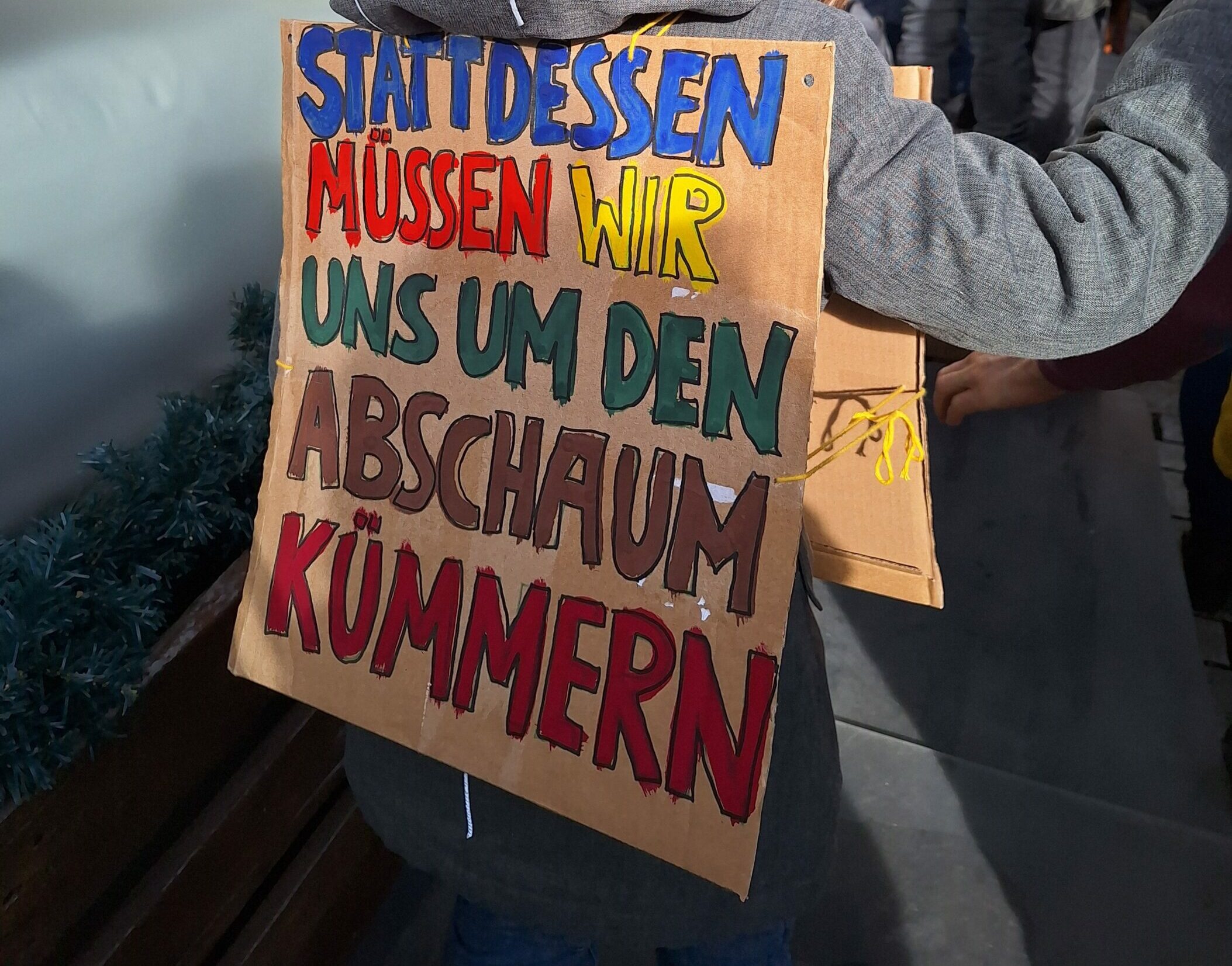 Ebenfalls im hinteren Bereich an den Sitzbänken vor dem Wasserspiel hielten einige Jugendliche ein Schild hoch, auf dem stand: „Gegen JEDE Form von Extremismus!“ Das Schild durfte von uns fotografiert werden, die Trägerinnen selbst baten darum, nicht mit abgebildet zu werden.