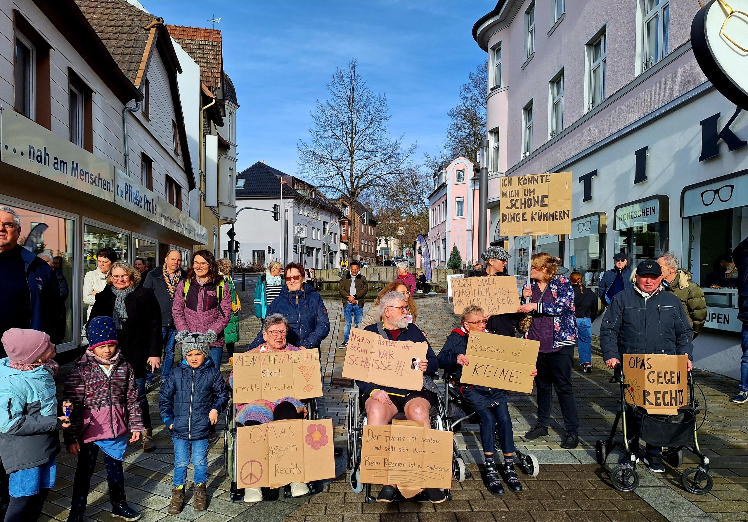 Die bunte Kundgebung wurde auch zu einem Treffen der Generationen, das neben vielen Kindern auch eine Seniorengruppe der „Omas“ (und Opas) „gegen Rechts“ umfasste.