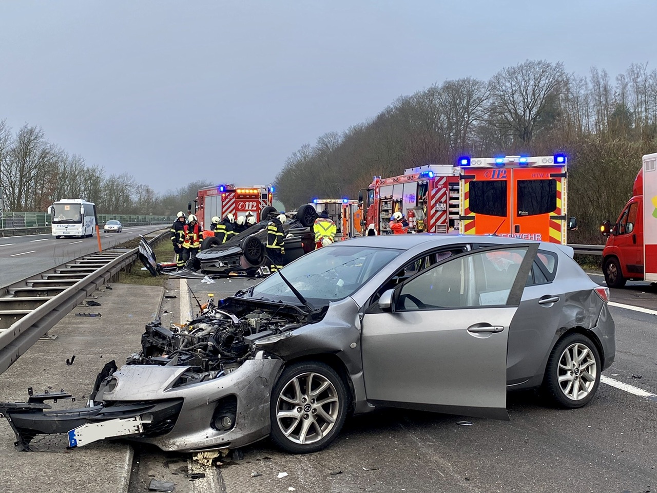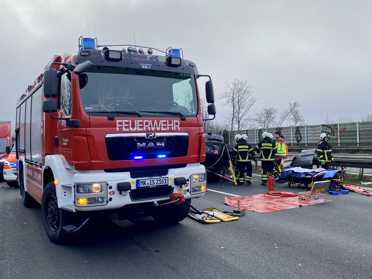 Um 8.11 Uhr wurde die Feuerwehr Iserlohn alarmiert. Im Bereich des Rastplatzes Heimberg waren drei Fahrzeuge zusammengeprallt. Ein beteiligter PKW hatte sich überschlagen und war auf dem Dach liegengeblieben.