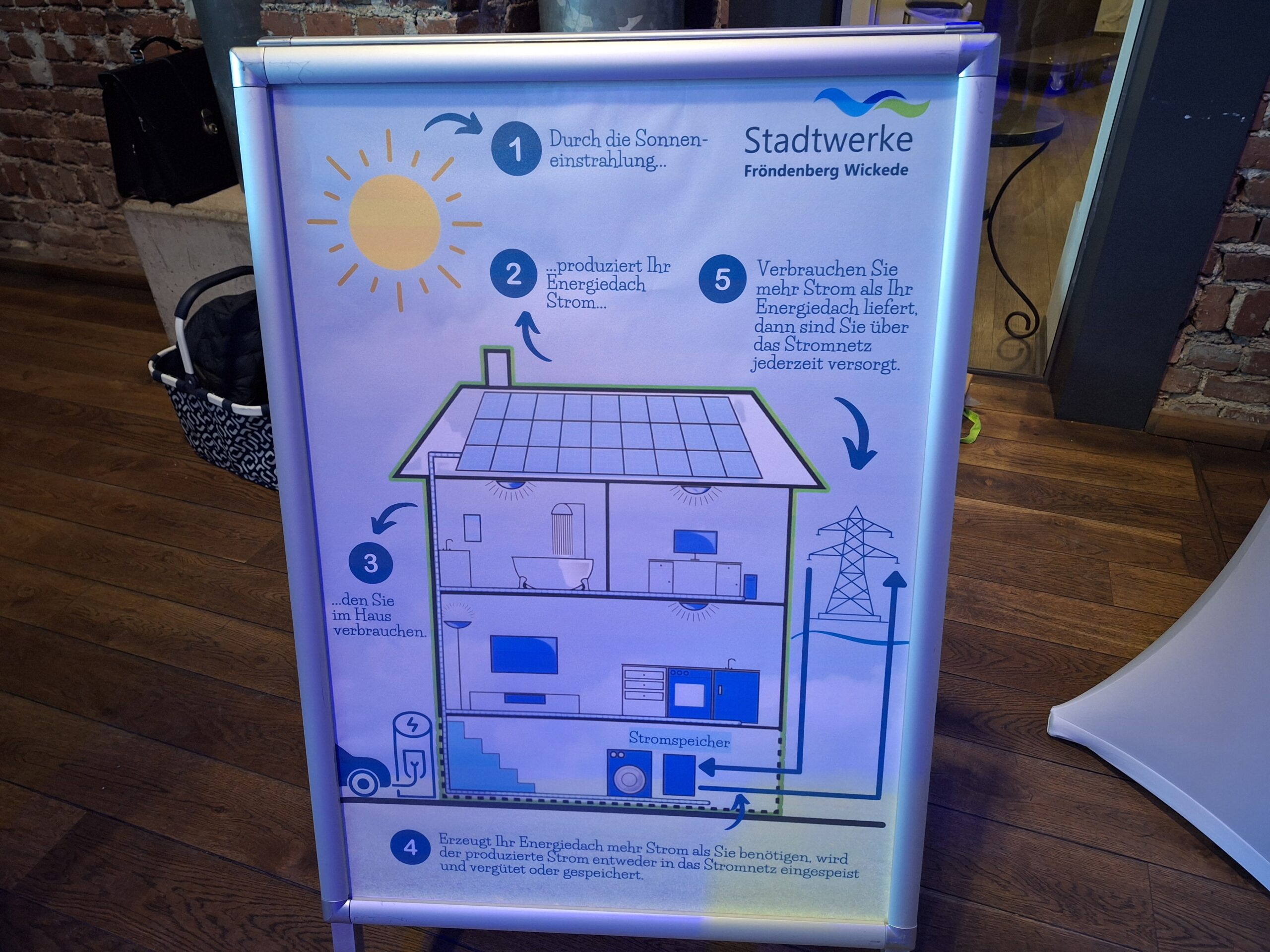 Im Anschluss konnten sich die Besucher an Infoständen der anwesenden Fachunternehmen, darunter natürlich auch die Stadtwerke Fröndenberg Wickede als lokaler Versorger, individuell und ganz praktisch über Solardächer, Wärmepumpen und die jeweiligen Möglichkeiten für die eigene Immobilie informieren.