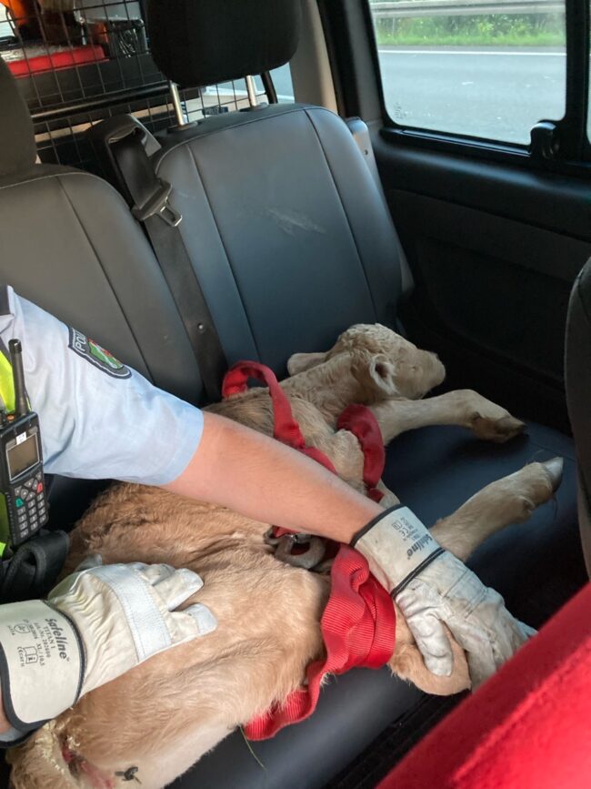 Schließlich nahm das recht zufrieden wirkende Kalb auf dem Rücksitz des geräumigen Streifenwagens Platz und richtete es sich dort an der Seite eines gut aufpassenden Polizisten gemütlich ein.