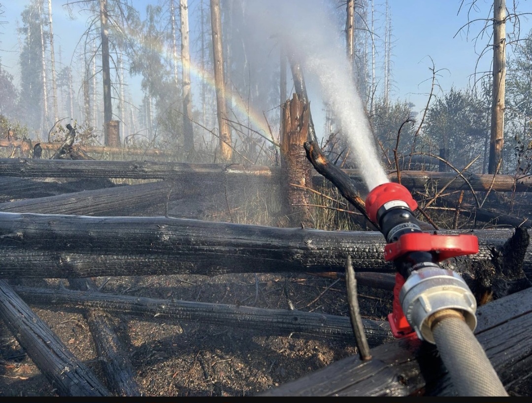 Da der betroffene Bereich weiterhin nicht betreten werden konnte, wurde die Brandstelle durch den Einsatz von Kreissegmentregnern großflächig umstellt, um eine kontinuierliche Bewässerung über Nacht sicherzustellen.
