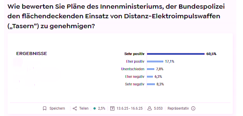 „Wie bewerten Sie Pläne des Innenministeriums, der Bundespolizei den flächendeckenden Einsatz von Distanz-Elektroimpulswaffen („Tasern”) zu genehmigen?“