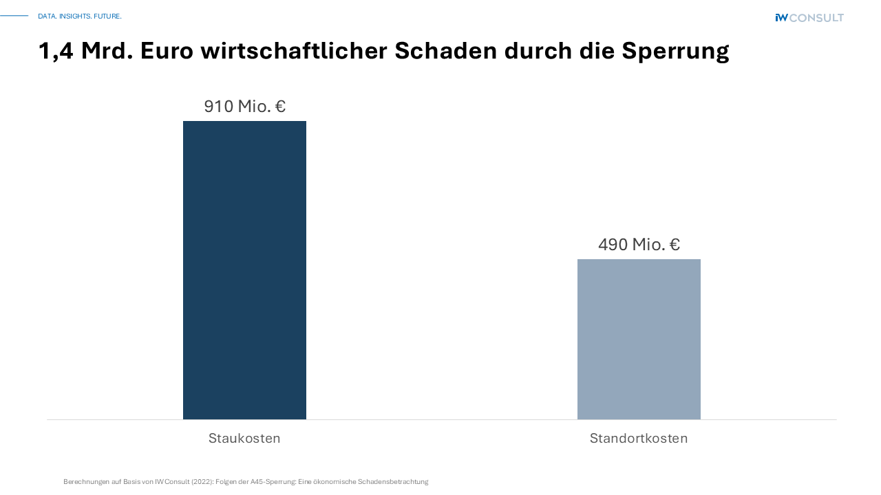 „Die Abhängigkeit der gesamten Region von der A 45 ist außergewöhnlich hoch und erklärt die überproportional hohen volkswirtschaftlichen Schäden“, erläutert Kempermann. „Aus volkswirtschaftlicher Sicht ist eine integrierte Planung von Brücken, Autobahnkreuzen und Fahrbahnen auf der A 45 ein sinnvoller Ansatz, um den Wirtschaftsregionen entlang der Trasse weitere Schäden in Milliardenhöhe zu ersparen“, unterstützt Kempermann die Forderung.