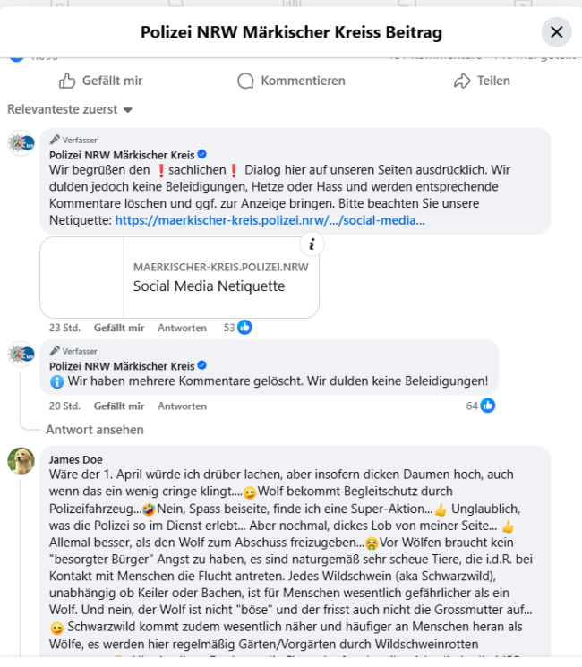 „Unser Job ist die Abwehr von Gefahren. Und zwar für Mensch UND Tier. Solche Einsätze kommen tatsächlich regelmäßig vor. Egal ob Hunde, Kühe, Pferde, Lamas oder eben der Wolf…“