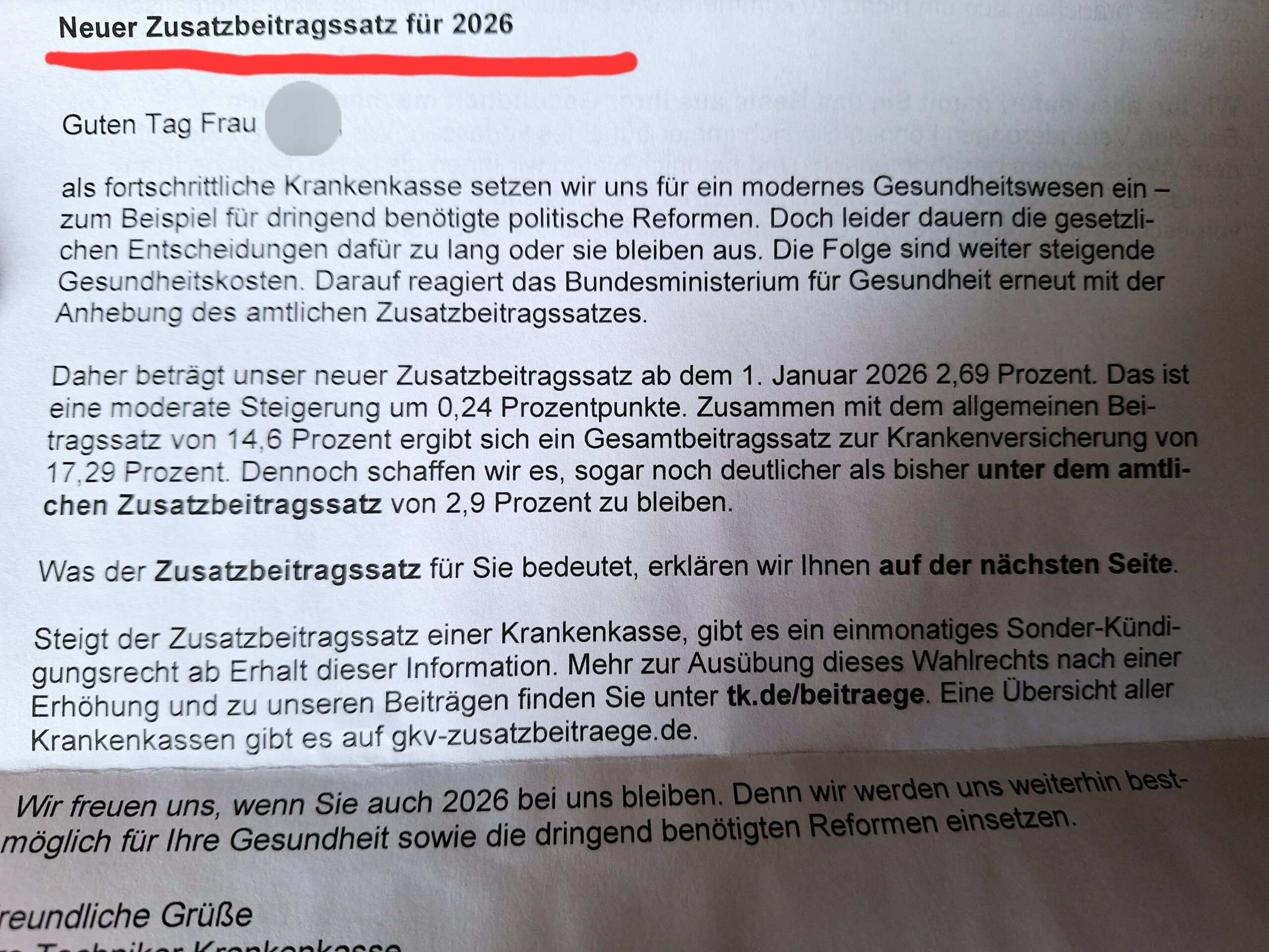 So fanden zum Beispiel Versicherte der Techniker Krankenkasse aus dem Kreis Unna am Dienstag vor Heiligabend (23. 12.) zwischen Weihnachtswerbung und Weihnachtspost einen Brief mit blauem TK-Logo auf dem Umschlag, in dem die Kasse eine Erhöhung der Zusatzbeiträge ankündigt. Sie gilt ab dem 1. Januar 2026.