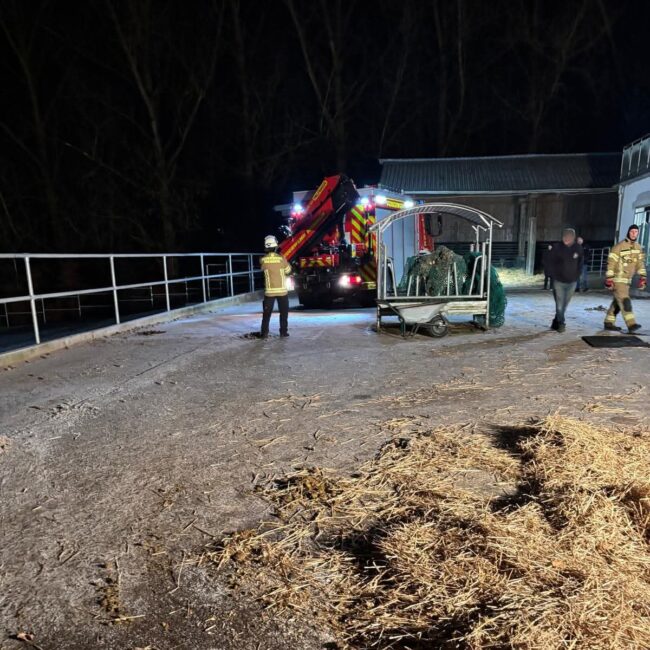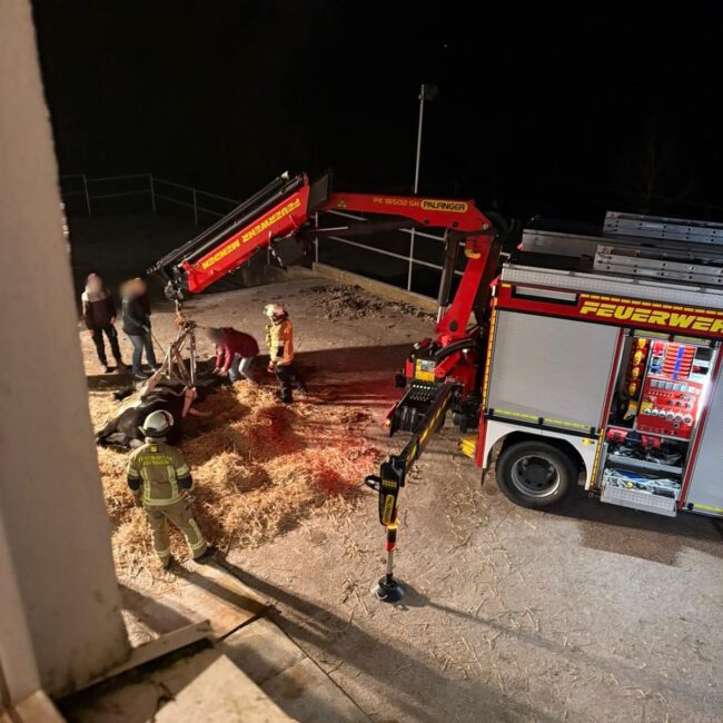 Daraufhin brachte die Feuerwehr den Rüstwagen mit Kran in Stellung und baute ein spezielles Großtierhebegeschirr unter dem Tier ein.